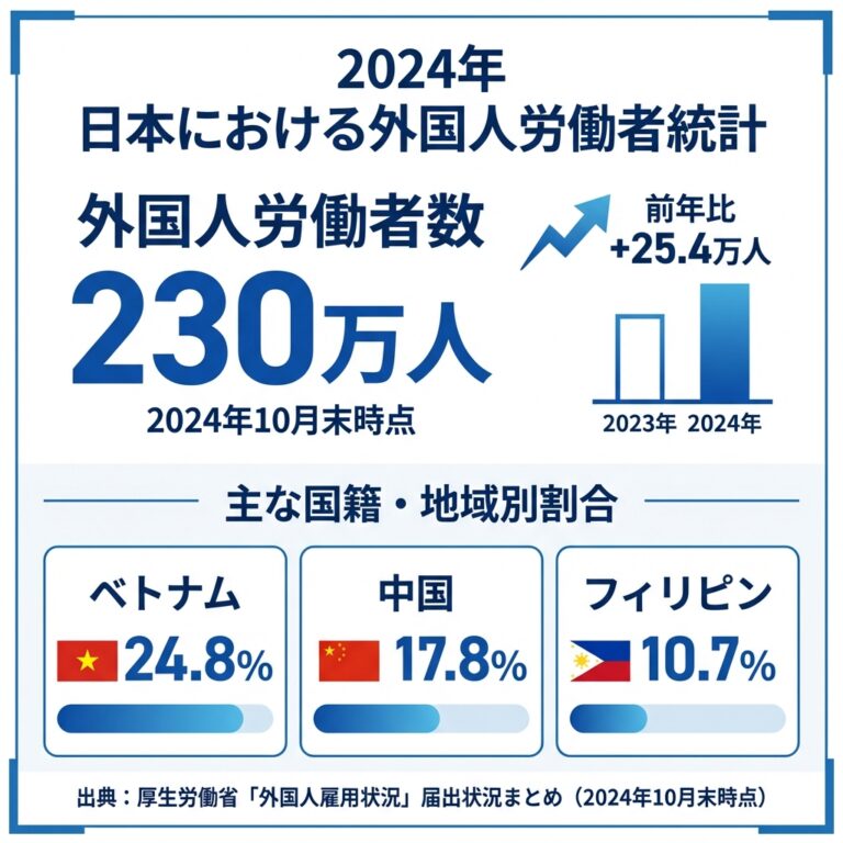 厚生労働省「外国人雇用状況」(2024年10月公表)によると、日本で働く外国人労働者数は約230万人。過去最高を更新し、前年比約12%増という急成長を見せています。