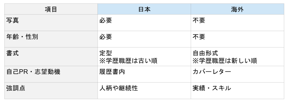 日本の履歴書は、海外と比較すると、写真の撮り方に細かい決まりがある、学歴・職歴は古い順に記載する等、独特のルールが多くあります。特に志望動機の欄については、海外ではカバーレターという形式で任意提出が主流であり、履歴書自体に記載する文化がありません。